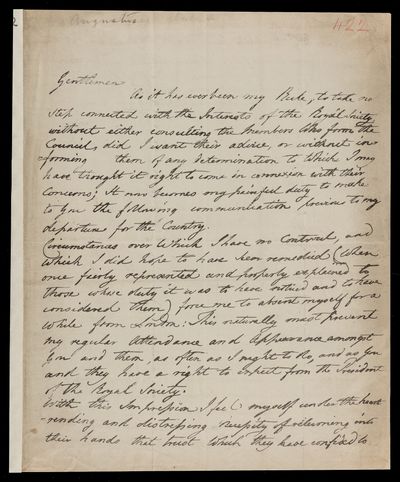 Lithographed circular signed by sender. Stating his reasons for his resignation from the presidency of the Royal Society [of London]