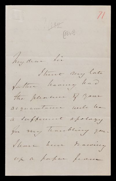 Autograph letter signed by sender. Sending a paper, compiled from his late father's notes, for an escapement for an astronomical clock. Would be pleased if John Frederick William Herschel would communicate it to the Royal Society [of London]