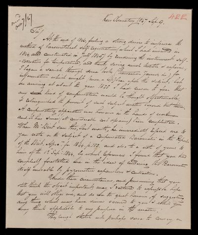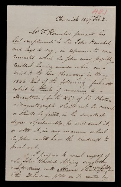 8 February 1847 Sender: Francis Ronalds Reference number: HS/14/421