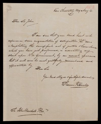 Letter. Wishes to use remarks John Frederick William Herschel made at Kew Observatory in 1846 for a Royal Society publication. Asks John Frederick William Herschel to read transcript for accuracy.