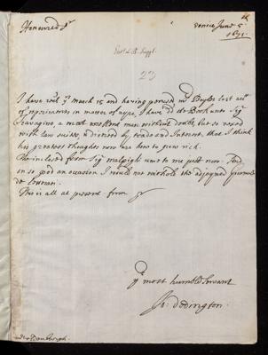 22 April 1672 Sender: John Dodington Reference number: EL/D1/28