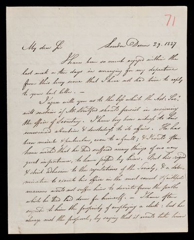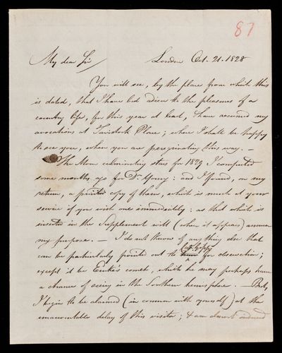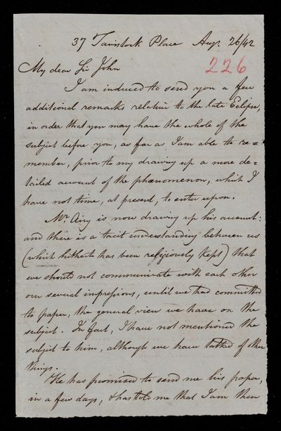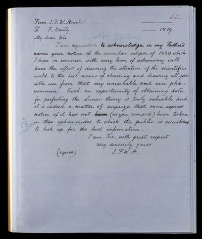 Autograph letter signed by sender. Acknowledges in John Frederick William Herschel's father's name Francis Baily's notice of the upcoming annular eclipse of 1820. Stresses the importance of observing it.