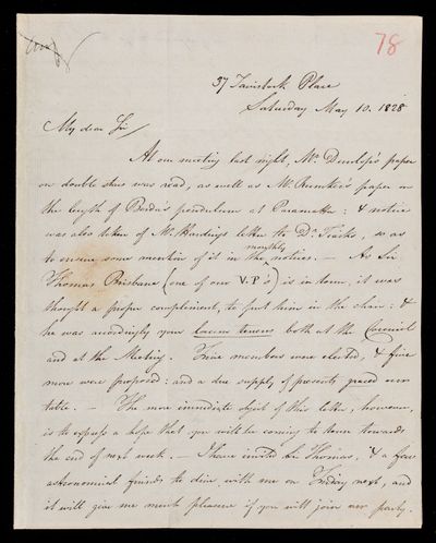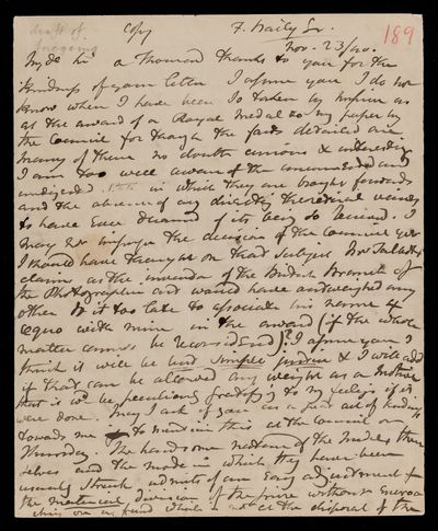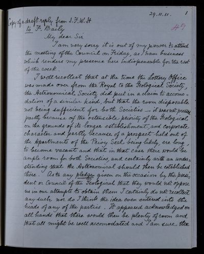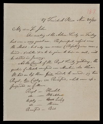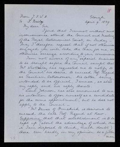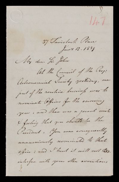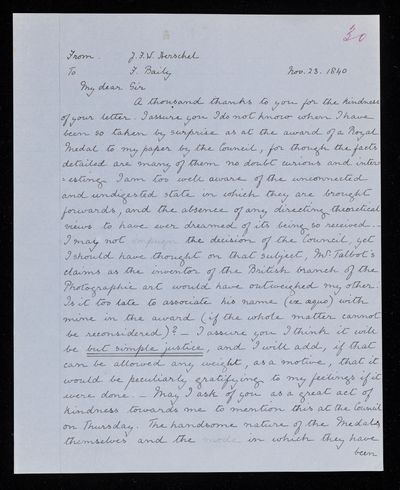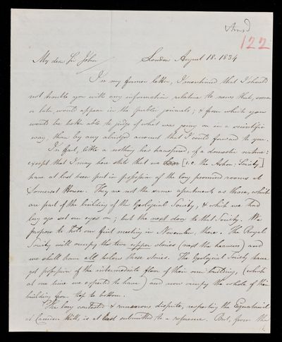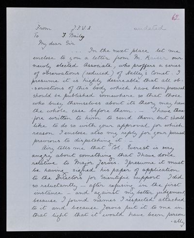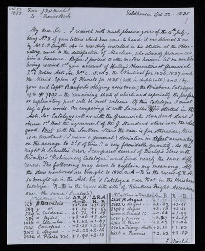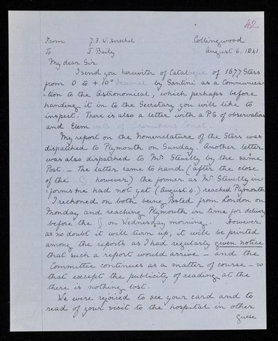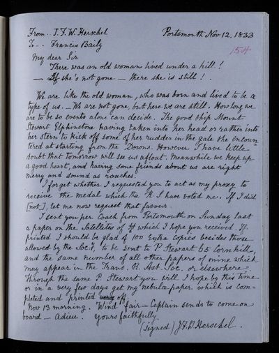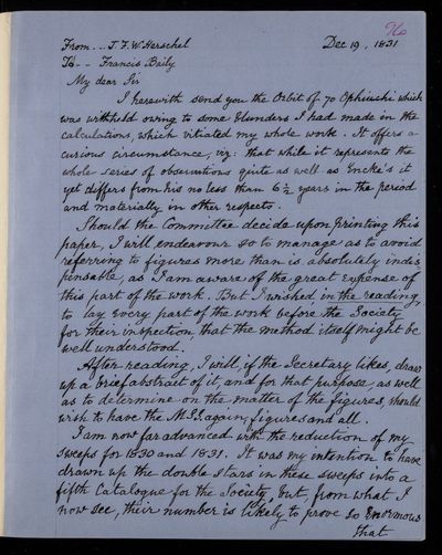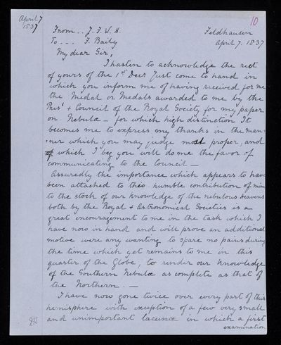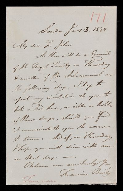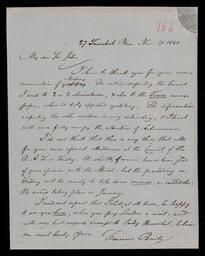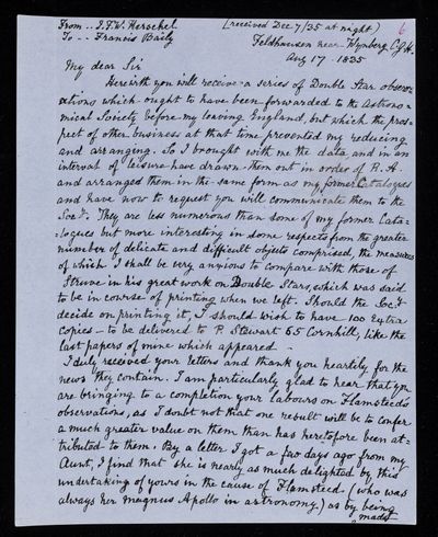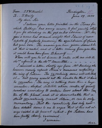 30 July 1822 Sender: Francis Baily , Francis Baily Reference number: HS/3/54John Frederick William Herschel receives the Bakerian Medal of the Royal Society.