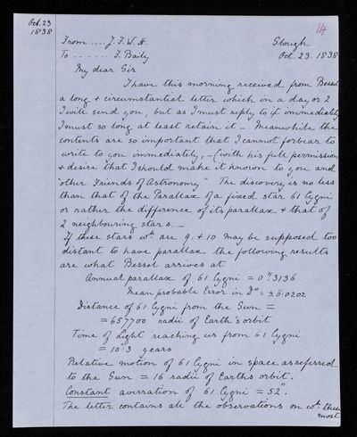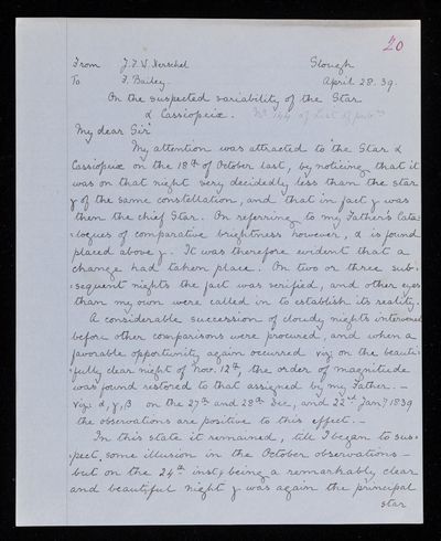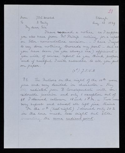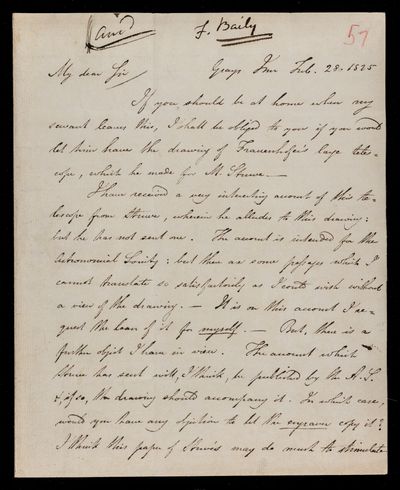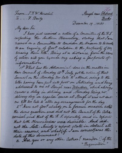 20 February 1824 Sender: Francis Baily , Francis Baily Reference number: HS/3/56John Frederick William Herschel invents the actinometer to measure the heating power of the Sun’s rays