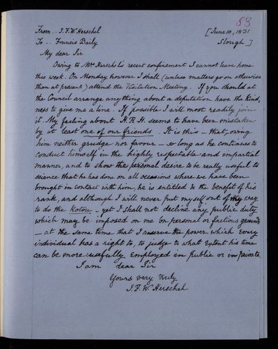 28 June 1843 Sender: Francis Baily , Francis Baily Reference number: HS/3/250