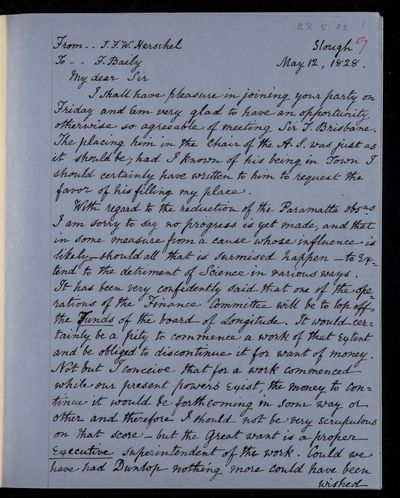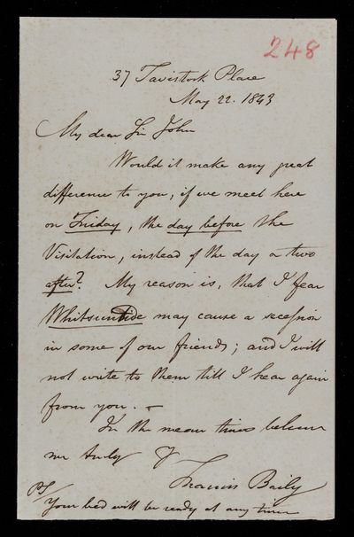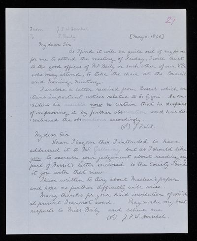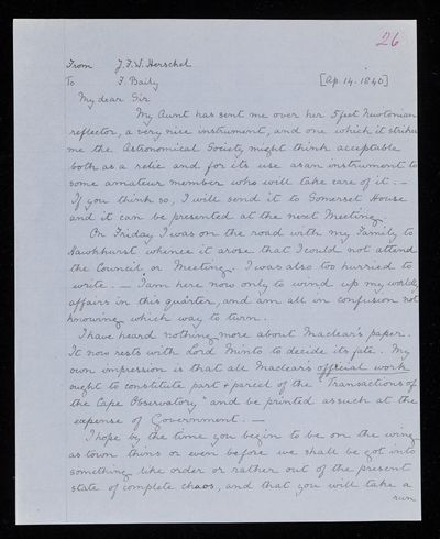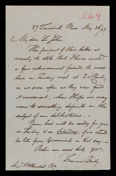 26 May 1843 Sender: Francis Baily , Francis Baily Reference number: HS/3/249