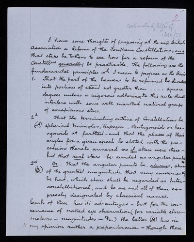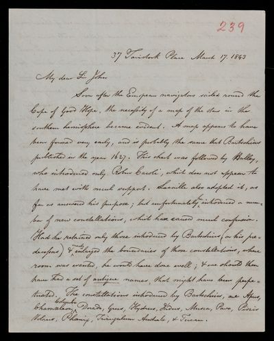 Copy of letter, copied as part of the correspondence project led by Colonel John Herschel FRS following the death of his father. Further regarding the revision of the constellations.