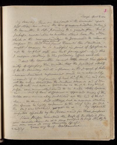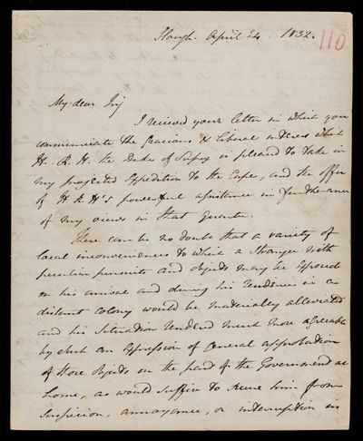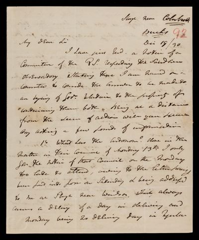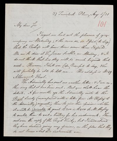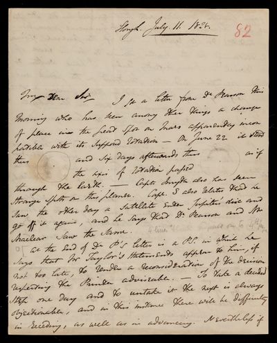 Autograph letter signed by sender. Regarding the printing of the report and sanction of council. Details several points on which he requires guidance. New observatories in India. Can John Frederick William Herschel dine with him on Thursday?