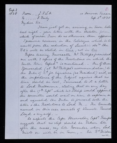 12 September 1843 Sender: Francis Baily , Francis Baily Reference number: HS/3/258