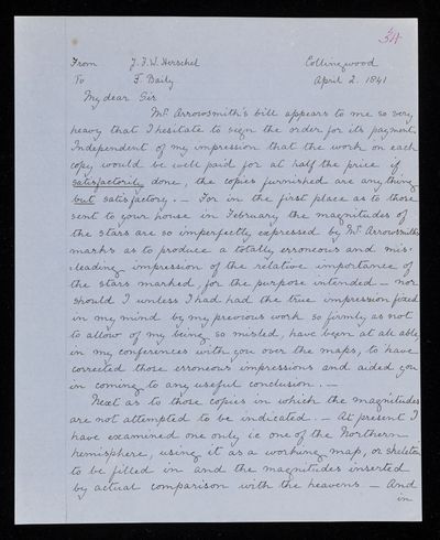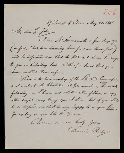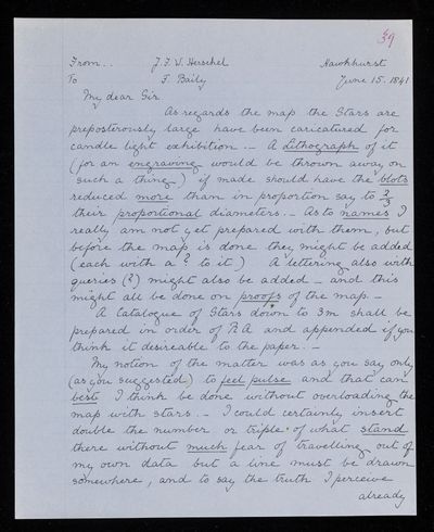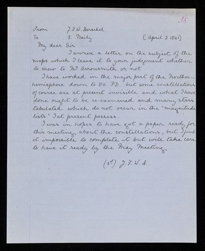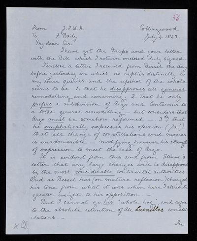 Autograph letter signed by sender. Has received the maps. Gives F. W. Bessel's views on the re-arrangement of the constellations which has been proposed. Comments on Francis Baily's memorandum.