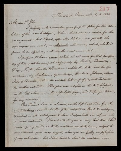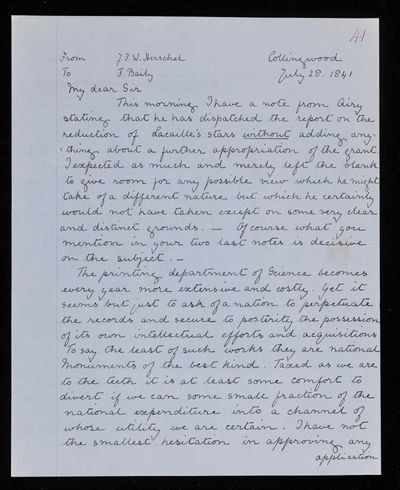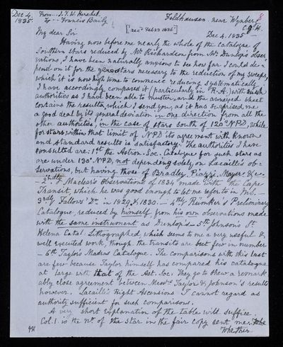 Autograph letter signed by sender. Regarding the cost of printing the catalogues, and matters pertaining to them. Can Francis Baily give him any general table of processions. Has started work on the letter press of his own book.