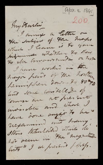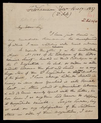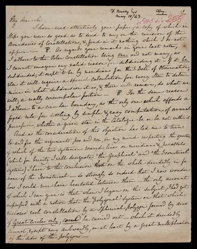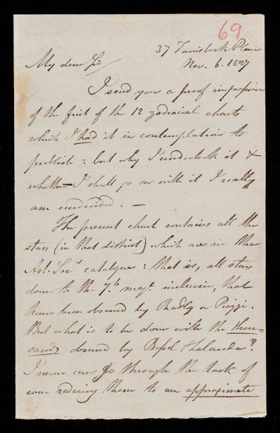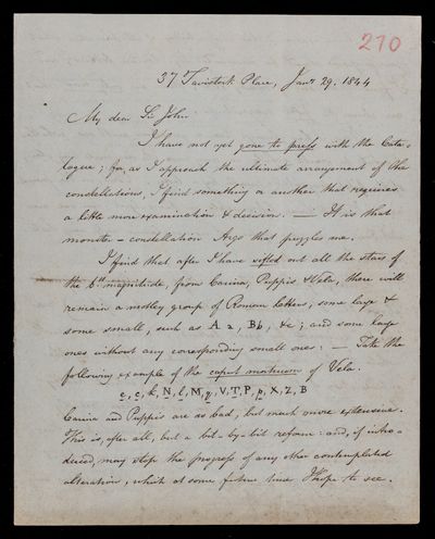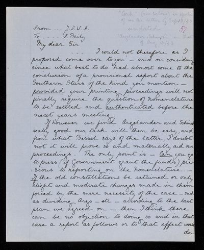 Autograph letter signed by sender. Has a copy of F. W. A. Argelander's Uranometria. Comments on this in relation to the proposed revision of the constellations.