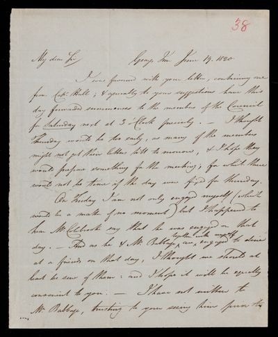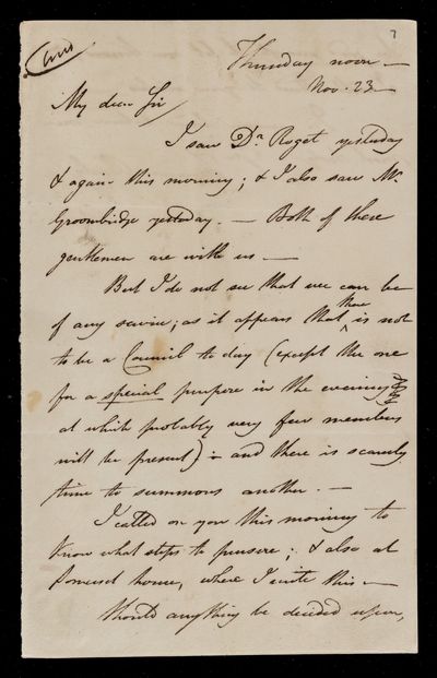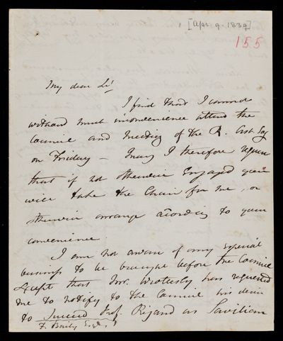 Autograph letter signed by sender. Is sorry John Frederick William Herschel could not manage the Council meeting last Monday. Suggests a date for the next meeting.