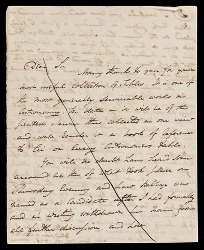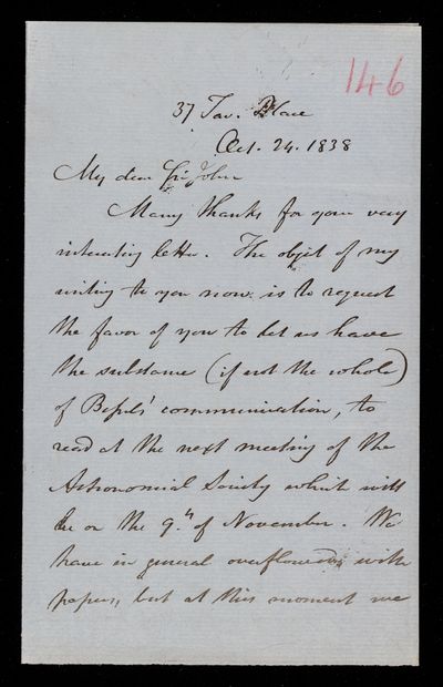 Autograph letter signed by sender. Returns F. W. Bessel's letter, part of which has been read to the Royal Astronomical Society Has he any communications for the Royal Astronomical Society as they are short of suitable material?