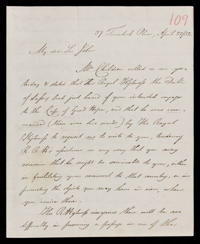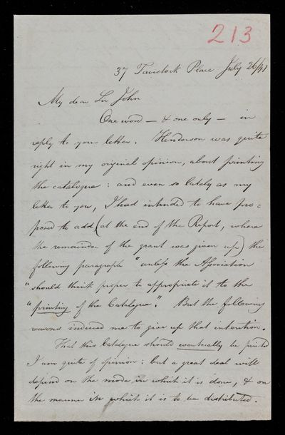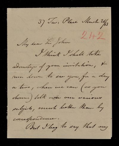 Autograph letter signed by sender. Has to come to town for a Trustee meeting of the British Museum and wonders whether it would be convenient for him to visit Tavistock Place to consult him on various matters.