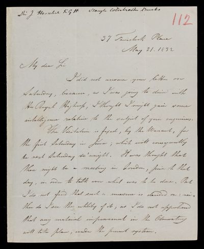 Copy of letter, copied as part of the correspondence project led by Colonel John Herschel FRS following the death of his father. Has to come to town for a Trustee meeting of the British Museum and wonders whether it would be convenient for him to visit Tavistock Place to consult him on various matters.