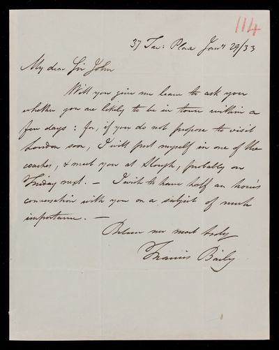 29 January 1844 Sender: Francis Baily , Francis Baily Reference number: HS/3/270