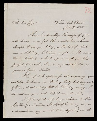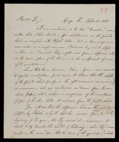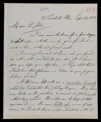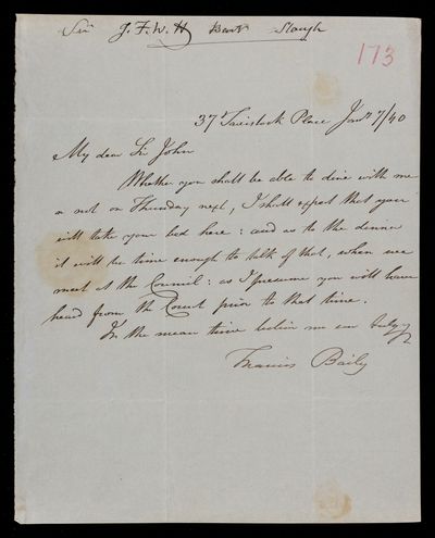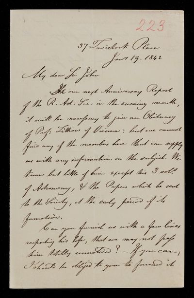 18 February 1823 Sender: Francis Baily , Francis Baily Reference number: HS/3/55John Frederick William Herschel moves to 56 Devonshire St., Portland Place, London