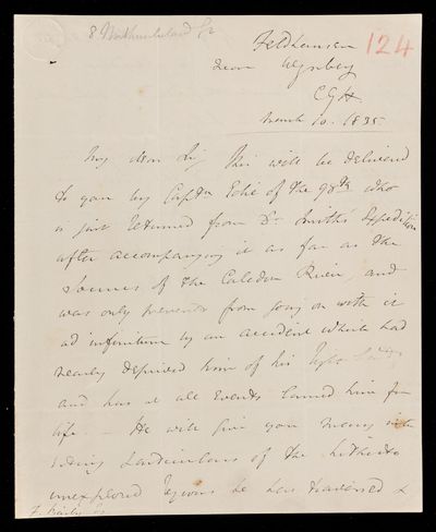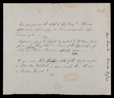 Autograph letter signed by sender. Can he give him the address of Capt. W. E. Parry? Should he send a report to Humphry Davy?
