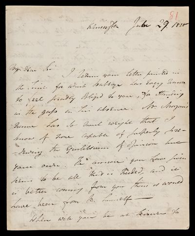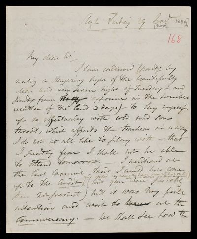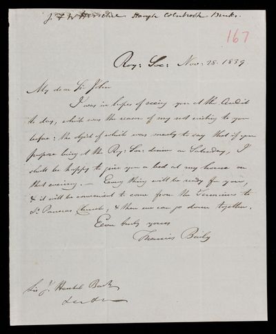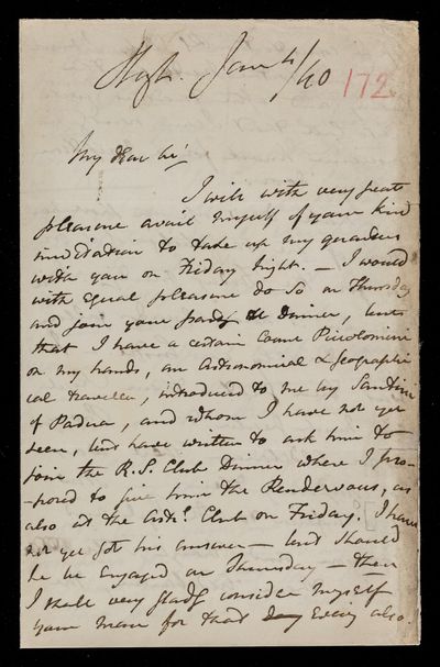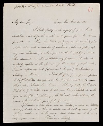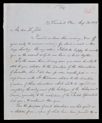 Autograph letter signed by sender. It will be quite convenient for John Frederick William Herschel to visit him on Friday. Sister's health is improved. Delay in the celestial maps ordered.