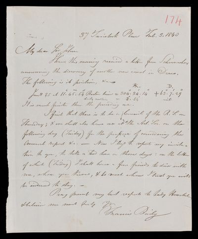 15 February 1844 Sender: Francis Baily , Francis Baily Reference number: HS/3/274