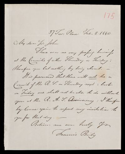 Autographed letter . If Francis Baily will send him his paper on the eclipse, he will write his report. Regarding the publication of information received from various members. Duties of the Foreign Secretary.