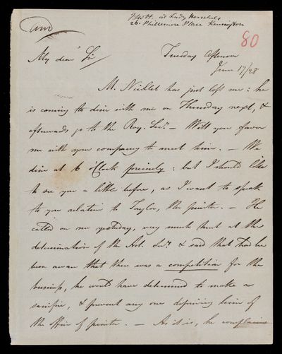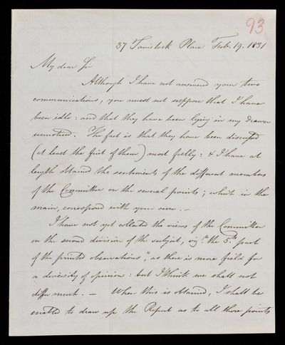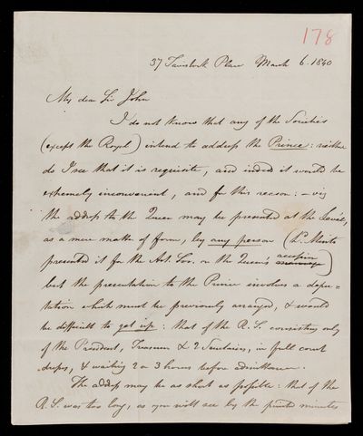 Autograph letter signed by sender. Has sent the Address to the printers for the corrections to be made. Committee meeting on Tuesday next. Hopes John Frederick William Herschel can come.