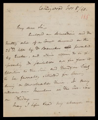Autograph letter signed by sender. Regarding the observations of John Frederick William Herschel and Giuseppe Piazzi on 'Comae.'