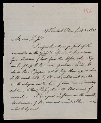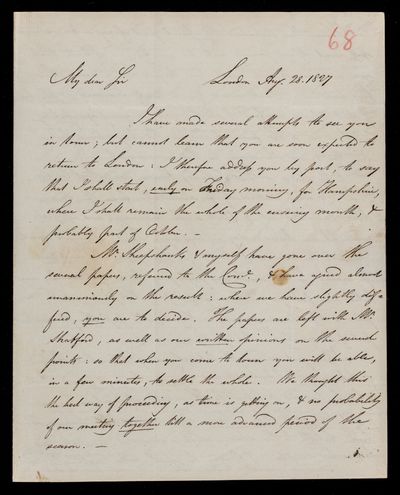 Autograph letter signed by sender. Has been absent and is sending letter he found on return, and a copy of his own remarks on J. J. Littrow's formula. Regarding the best method of procuring the Memoirs. Can lend him a copy of W. T. Brande's Journal if he would like it.