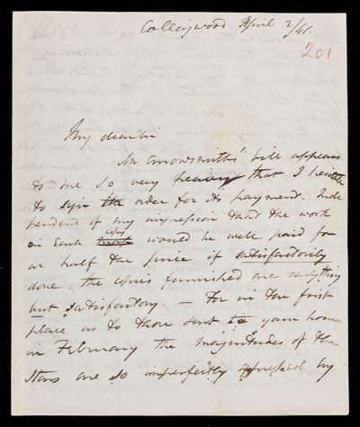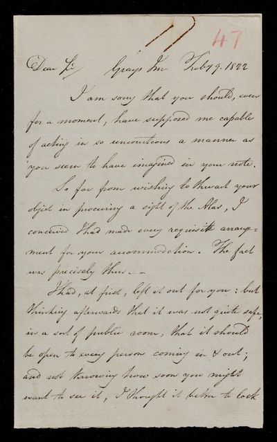 Autograph letter signed by sender. Reasons why John Frederick William Herschel was unable to see the Atlas when he called.