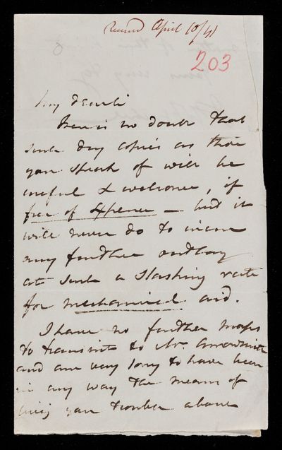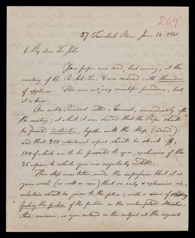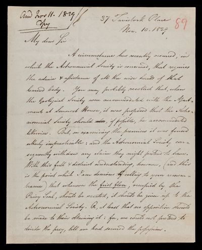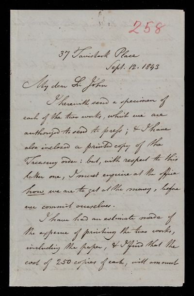 Autograph letter signed by sender. Regarding the printing and distribution of John Frederick William Herschel's Address.