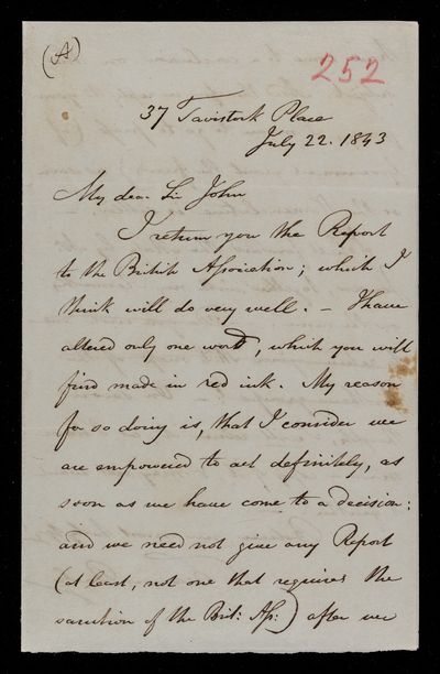 Autograph letter signed by sender. Is returning the report to the B.A.A.S., with one alteration. Will forward the map to Mr. Jensen with John Frederick William Herschel's remarks.