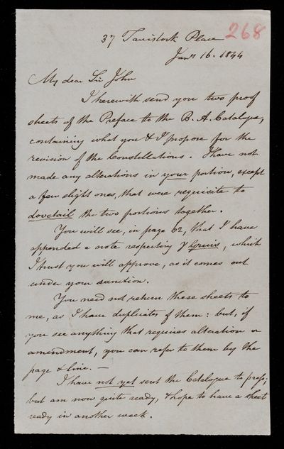 Autograph letter signed by sender. Sends proof sheets of the preface to the Star catalogue of the B.A.A.S., together with a few amendments. Has not sent the catalogue to press yet.