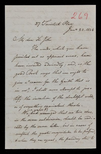 22 January 1844 Sender: Francis Baily , Francis Baily Reference number: HS/3/269