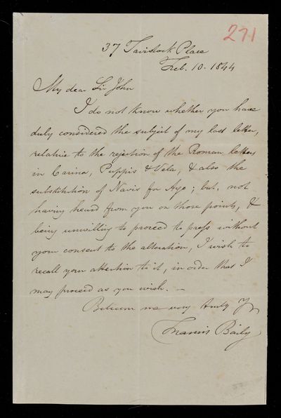 10 February 1844 Sender: Francis Baily , Francis Baily Reference number: HS/3/271