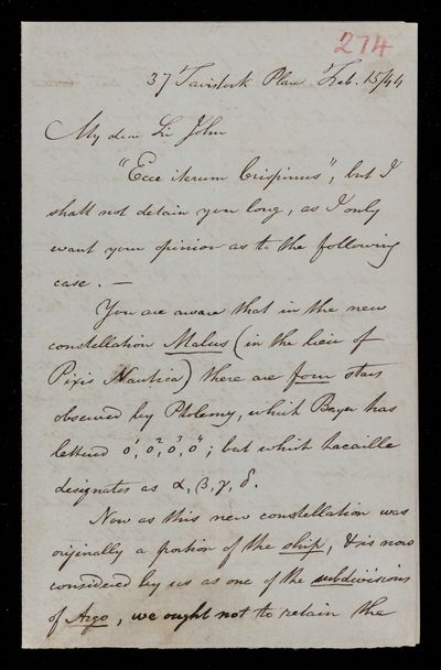 Copy of letter, copied as part of the correspondence project led by Colonel John Herschel FRS following the death of his father. Gives his own views regarding 'Argo' and the renaming of the constellations.