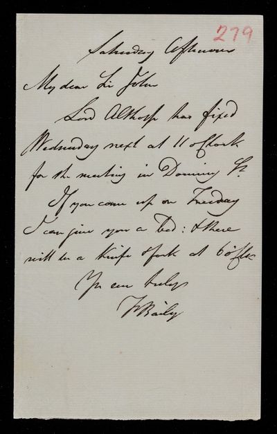 Autograph letter signed by sender. Meeting with J. C. Spencer (Viscount Althorp) next Wednesday at Downing St.