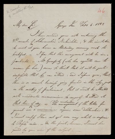 Autograph letter signed by sender. Regarding H. C. Schumacher's Nachrichten. Astronomical observations. Regarding foreign correspondents for the Astronomical Society.
