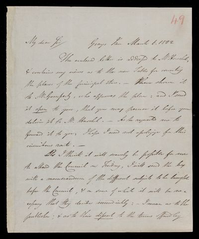 Autograph letter signed by sender. Regarding the plan of the tables for the places of the principal stars. Will be unable to attend the meeting of council on Friday. Will send memorandum for discussion.