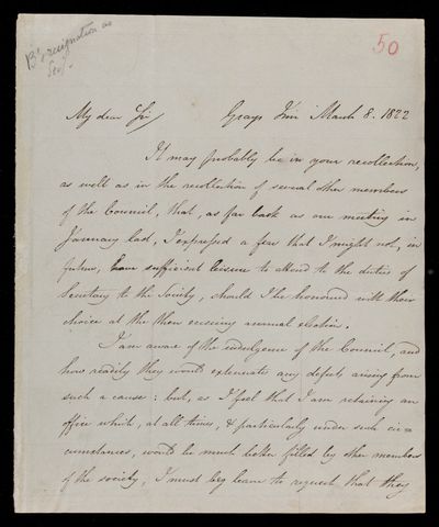 Autograph letter signed by sender. Wishes to resign from the secretaryship of the Astronomical Society.