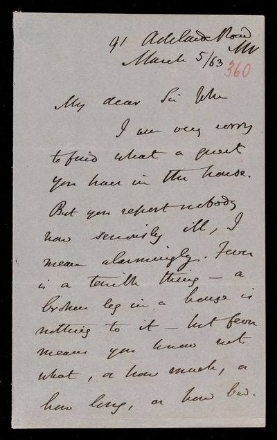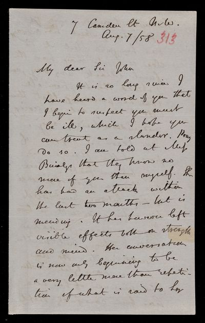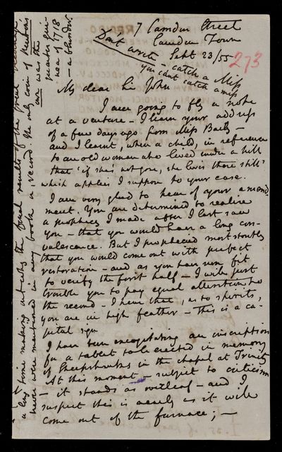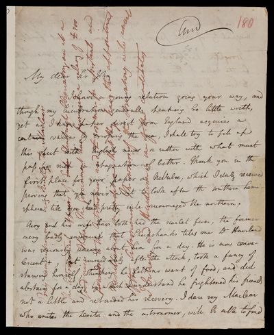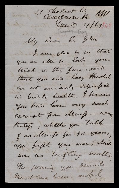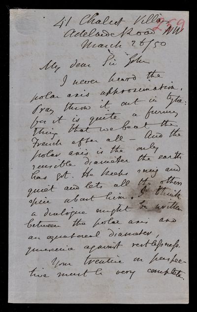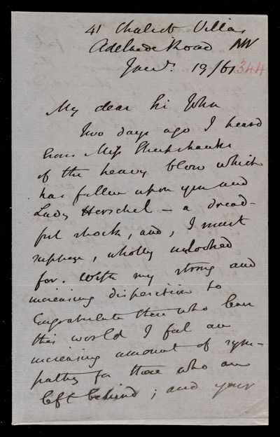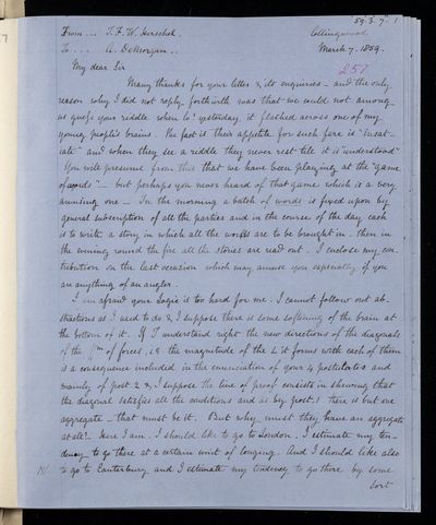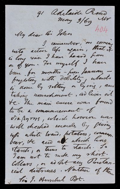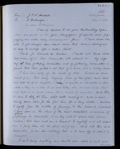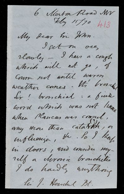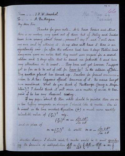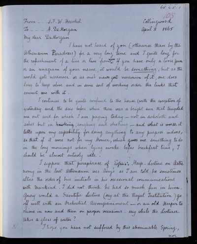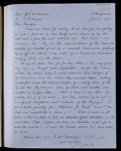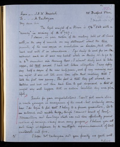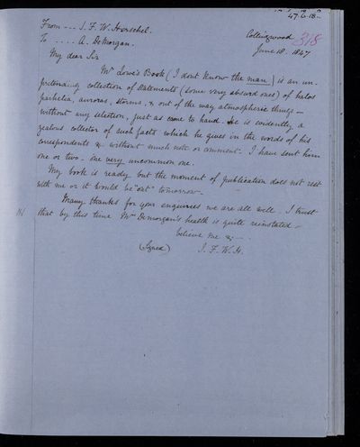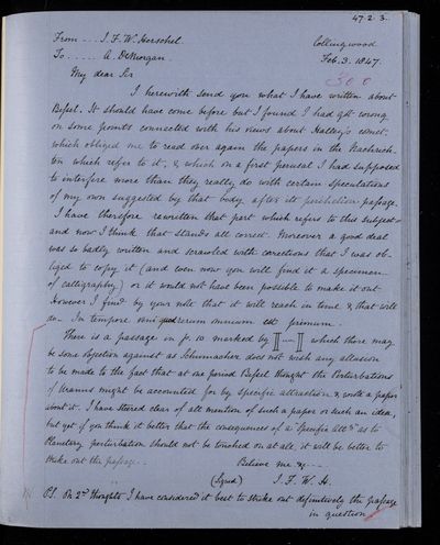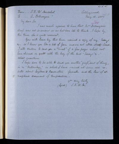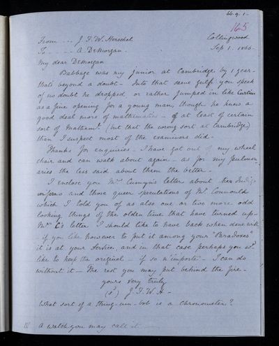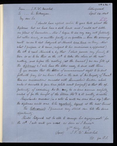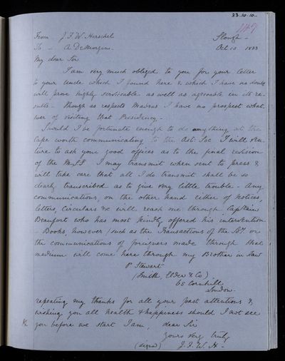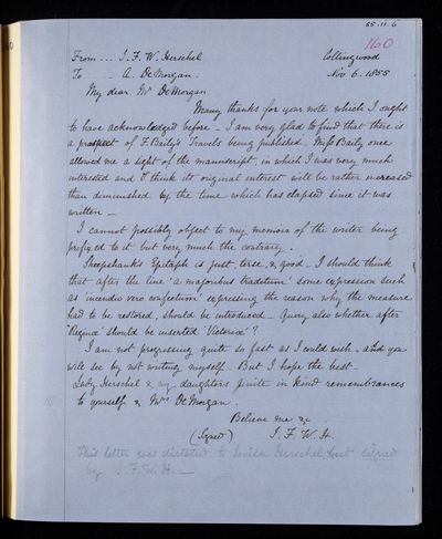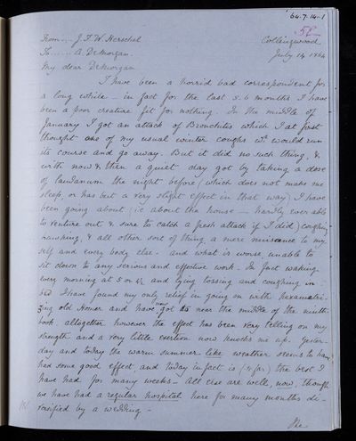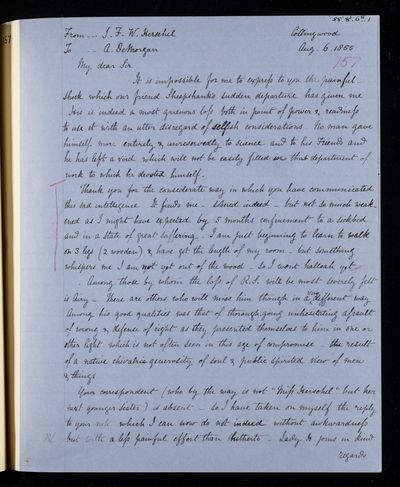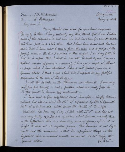Autograph letter signed by sender. John Frederick William Herschel's account of his own health is much better than he hoped for. Has he seen Augustus De Morgan's contribution to English?
