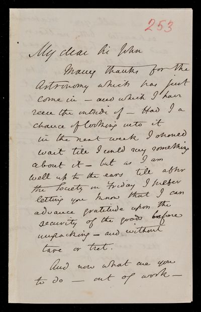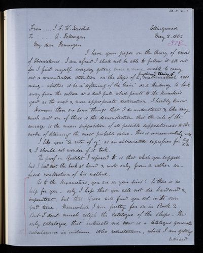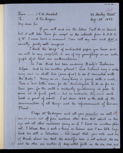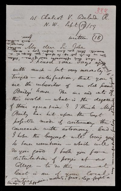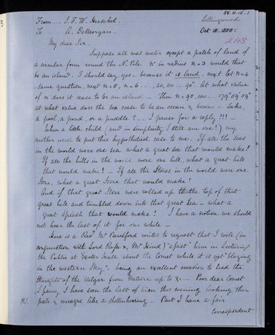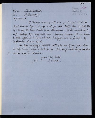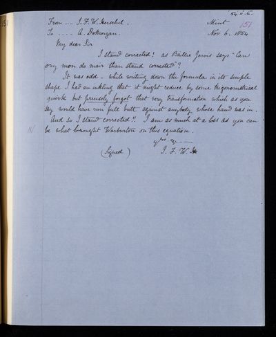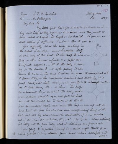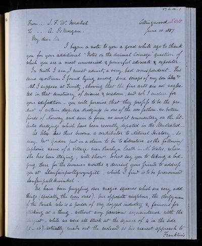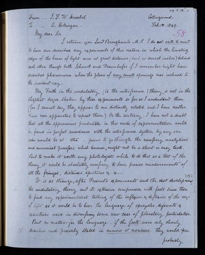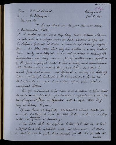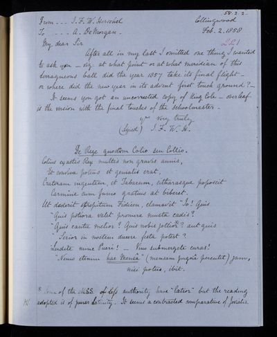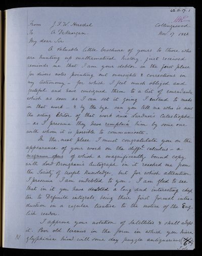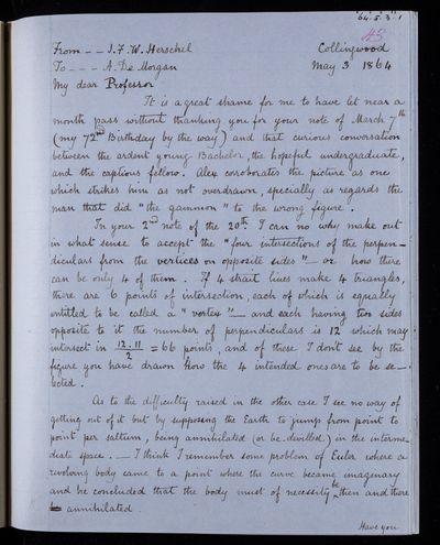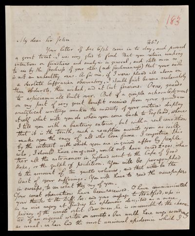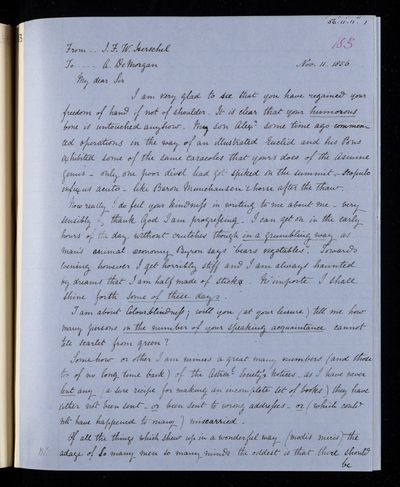 20 February 1837 Sender: Augustus de Morgan Reference number: HS/6/183Sir John Herschel returns from South Africa