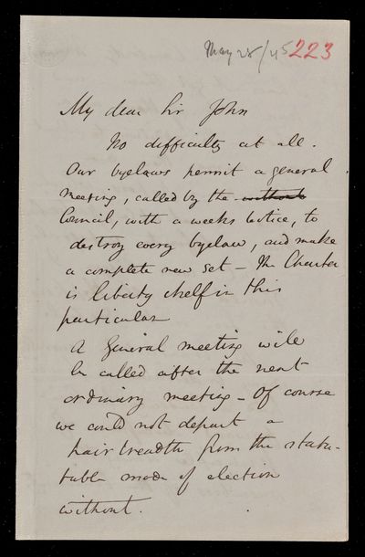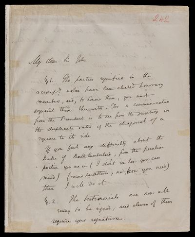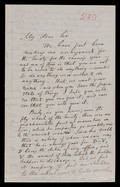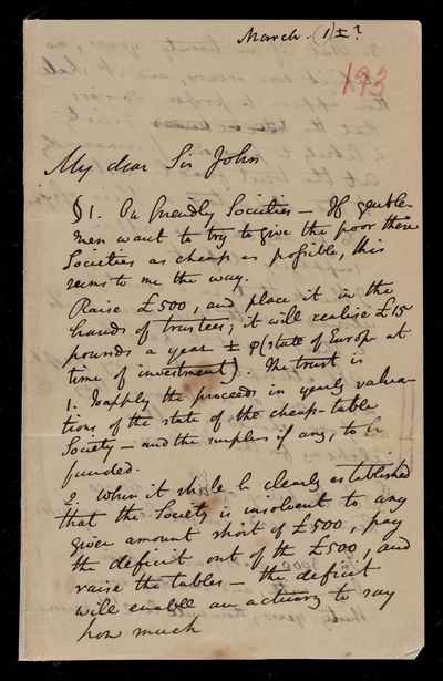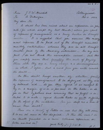 Autograph letter signed by sender. Just dispatched the letter when John Frederick William Herschel's arrived. Regarding benefit societies and their workings. Will write to J. W. Woolgar.