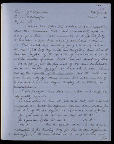 Autograph letter signed by sender. Regarding the workings of Insurance Companies and Benefit Societies. Recommends an actuary. Hopes John Frederick William Herschel will come down for the Anniversary meeting.