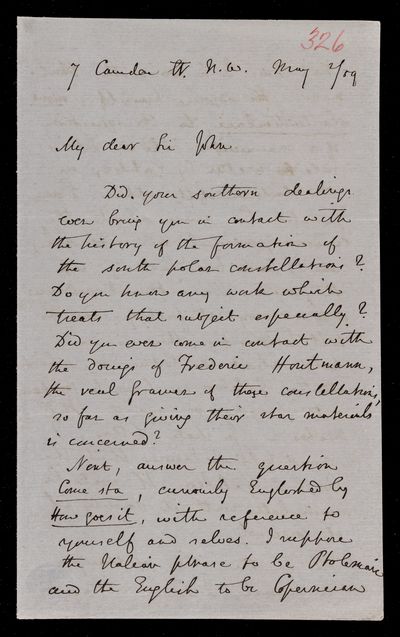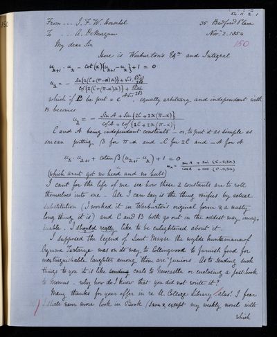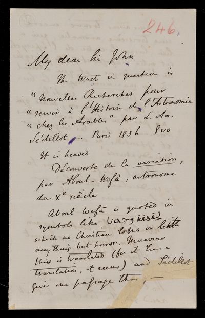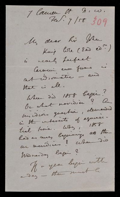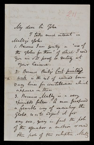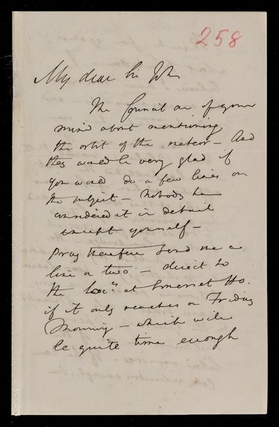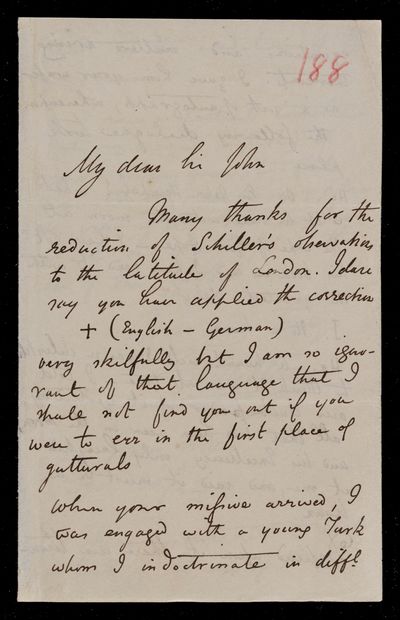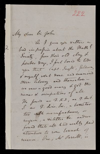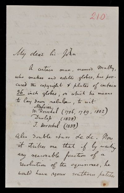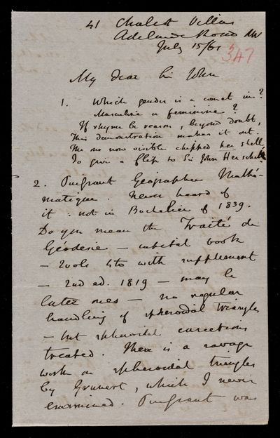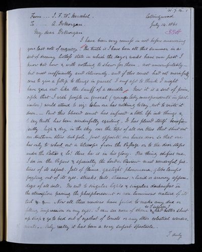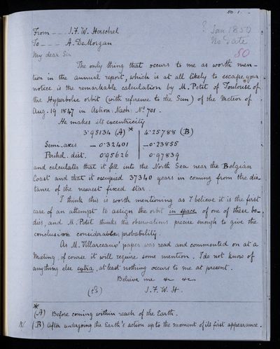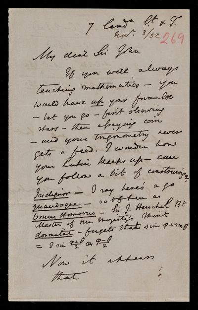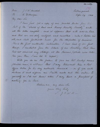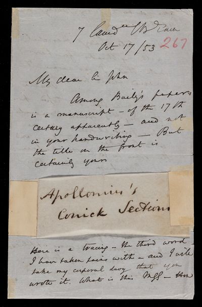 Autograph letter signed by sender. Hopes to have John Frederick William Herschel's catalogue for the first meeting of the Royal Astronomical Society Anything about the comet would be welcome. Regarding one of Franciscus Vièta's mathematical theories.