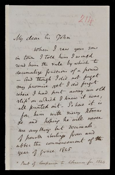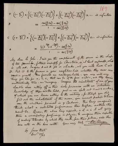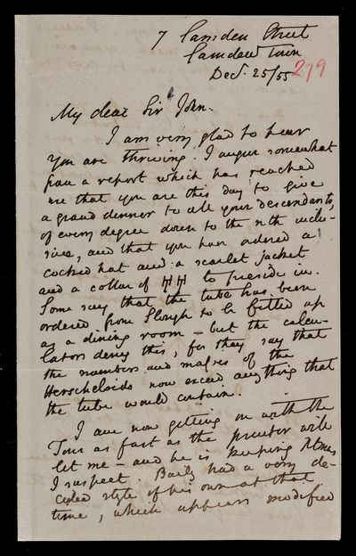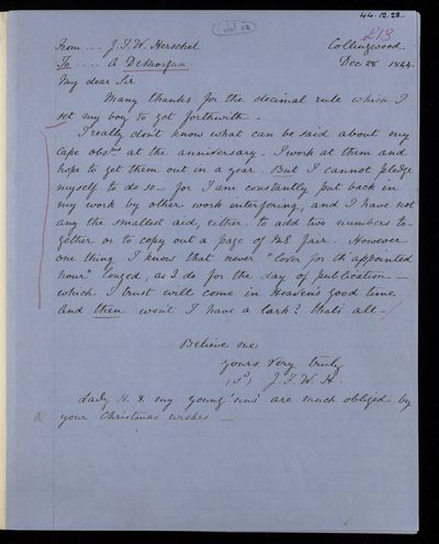 25 December 1843 Sender: Augustus de Morgan Reference number: HS/6/189Birth of Matilda Rose Herschel, daughter of John Frederick William Herschel and Margaret Brodie Stewart