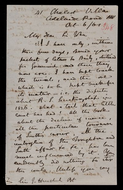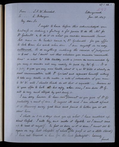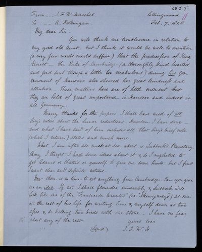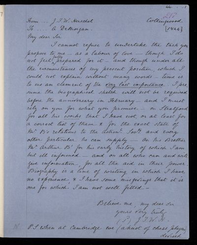 Autograph letter signed by sender. In one of John Frederick William Herschel's letters he mentions a name of a forger; was it G. B. Libri? It would not be easy to detect a forgery.