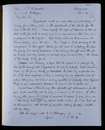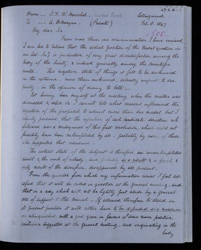 14 February 1834 Sender: Augustus de Morgan Reference number: HS/6/181Sir John Herschel serves as President of the Literary and Philosophical Society of the Cape of Good Hope