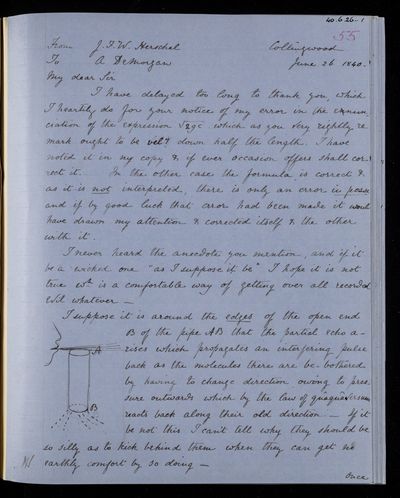 Copy of a letter. Thanks Augustus De Morgan for a correction in one of John Frederick William Herschel's writings; tries to explain the partial echo that occurs when blowing across the end of an open pipe.