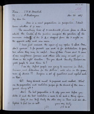 Autograph letter signed by sender. Regarding John Frederick William Herschel's new theory of perspective.